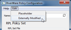 You can also manually indicate that an input event has been modified. This is useful when external files, such as a ruleset or data files, are modified, because RiverSMART is not aware of these changes. To indicate that an event has been modified, select Edit, then Externally Modified in the event configuration window. This has the same effect as modifying the event configuration: the event label turns red, and RiverSMART indicates that scenarios in which the event is included must be regenerated to bring the study up to date.