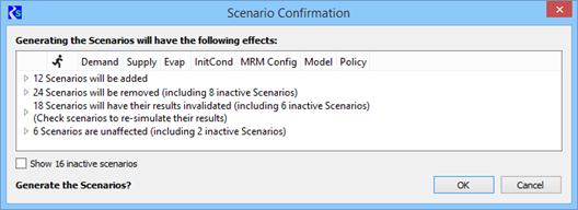 The Scenario Confirmation opens, listing the number of scenarios to be added, removed, invalidated, or unaffected, based on modifications made to input events since the last time scenarios were generated. To expand a row and list the scenarios in that category, select the arrow next to the row.