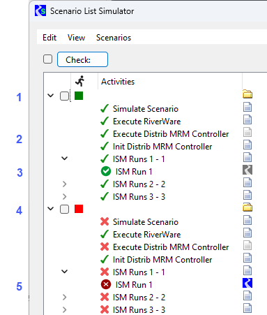 The Scenario List Simulator displays a two-level tree view that lists the activated scenarios at the top level. Within each scenario, the activities that have been completed during simulation are listed. To open this window, select Scenarios, then Simulate Scenarios on the RiverSMART menu.