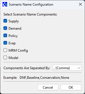 In this example, the same MRM Configuration and Model are used for all scenarios, so including them in the name adds no meaningful information to help differentiate among scenarios. The check boxes for these elements are therefore cleared to exclude them from the name. A comma is selected as the separator in the Components Are Separated By menu. An example scenario name is displayed at the bottom of the window.