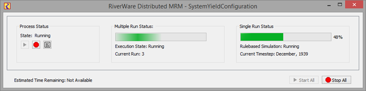 During simulation, the RiverWare Distributed MRM window is displayed. This window displays the progress of the runs as follows: