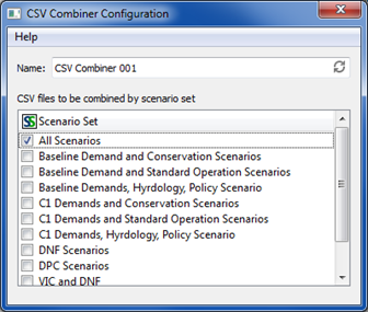 Select the check boxes of the scenario sets for which you want to combine CSV files. When the CSV Combiner is executed, an output CSV file is generated for the scenarios in each selected scenario set. Each CSV file is added to a subfolder of the ScenarioSet\ folder named with the scenario set name.
