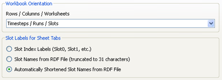 Because RiverWare slot names can be long, it can be challenging to fit them into the workbook, particularly for sheet tab labels, which are limited to 31 characters. The RDF To Excel event provides the following options for writing slot names to the workbook.