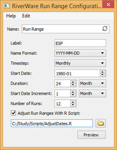 Run Range R Script) and displays the results in the RiverWare Run Range Preview window. This allows you to easily view the run ranges generated by the Run Range event and the adjustments made by the R script. Without this capability, you would need to generate the scenarios and compare two CSV files in the event Working\ folder.