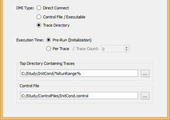 The following figure shows a Trace Directory DMI event using the %RunRange% variable. The scenarios using run range 1980‑01 will import the initial conditions in C:\Study\InitCond\1980-01; the scenarios using run range 1980‑02 will import the initial conditions in C:\Study\InitCond\1980-02, and so on.