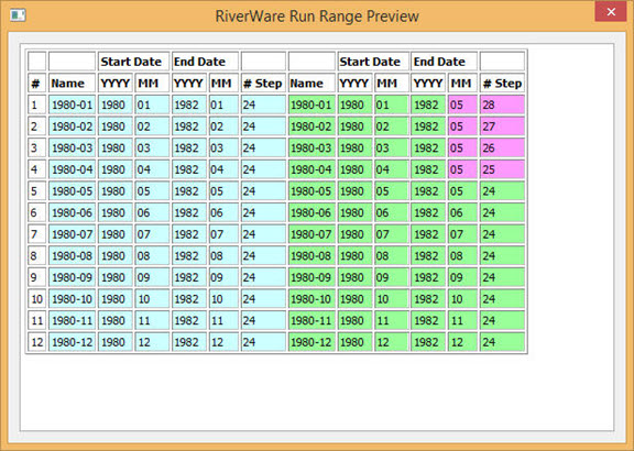 For the sample study there are 12 run ranges with a monthly timestep, beginning with each month from 1980-01 through 1980-12. The run duration is 24 months, with the exception that the policy requires the run ranges to extend through at least May of the end year. There are 12 run ranges, as shown in