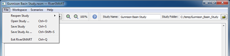 The File menu includes options for saving the study, opening an existing study, and exiting RiverSMART.