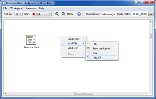 To add a file to the RiverSMART workspace, right-click the workspace, select Add File on the shortcut menu, and then select the file type. The following file types are available.