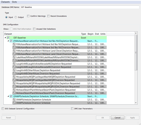 One approach would be to set up four DMIs in RiverWare and have each DMI event in RiverSMART refer to one of the RiverWare DMIs by name. To set up the DMIs in RiverWare, you would need to repeat much of the same configuration information four separate times: you would need to repeat the Excel dataset configurations, each of which specify a different worksheet in the same Excel workbook, for each DMI; more importantly, you would need to repeat the slots into which the demand data is imported. This would involve possibly hundreds of slots, and it would be a tedious and error-prone process to keep their begin dates, end dates, and units consistent across all DMIs. Figure 2.2 shows a sample RiverWare configuration of an Excel Database DMI with slot selections.