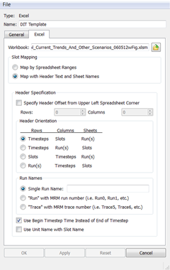 A better approach is to create one dataset and one DMI in RiverWare, to serve as a template for RiverSMART to use for each scenario. You can configure the Excel dataset to refer to the Excel workbook, leaving the Single Run Name (worksheet name) blank, as shown in the following figure.