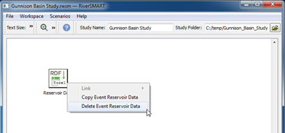 To delete an event from the workspace, right-click the event icon on the RiverSMART workspace and select Delete Event from the shortcut menu; alternatively, select the event and press Delete.