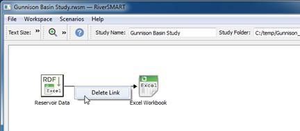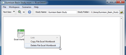 To delete a file from the study, right-click the icon on the RiverSMART workspace and select Delete File from the shortcut menu; alternatively, select the file and press Delete.