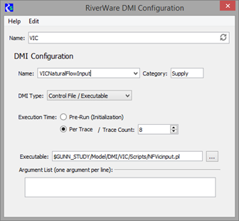 Specify a DMI to use in importing data into the RiverWare model. The input can be a single series, imported before the multiple runs are executed, or it can be trace-based, run as an ensemble. For example, the outputs of the Hydrology Simulator or Demand Input Tool (DIT) can be input to RiverWare through the DMI event.