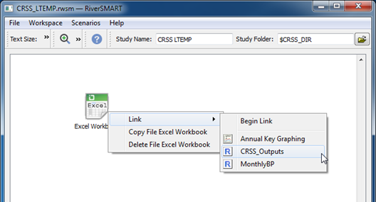 Only one RiverWare event is allowed in a study. In the example, RiverWare inputs are linked to RiverWare, on the left side of the workspace, with DMIs grouped into Demands, Supplies, and Evap. RDF files coming out of RiverWare are post-processed through a series of events and files, on the right side of the workspace, to produce GPAT graphs in Excel workbooks.