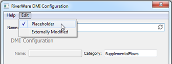 This option is available for input-type events: DMI, MRM, Policy, and Model. Sometimes, the choice of inputs in a study is not just between the type of inputs—for example, high or low demand—but between input or no input—for example, between Supplemental Flow A or no supplemental flow. For these cases, RiverSMART allows you to designate an input event as a placeholder. To do so, select Edit, then Placeholder in the DMI, MRM, Policy, or Model Configuration window.