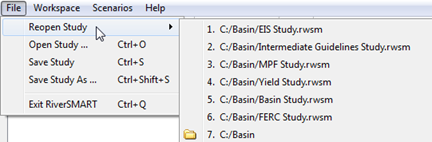 The File menu in the RiverSMART menu bar includes menu items to open and save study files. The Reopen Study menu lists the six most recently opened study files and folders.