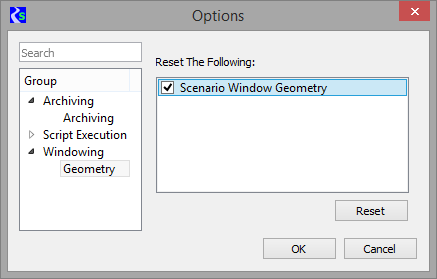 In the Group area of the Options window, select Windowing, then Geometry. Under Reset the Following, select the Scenario Window Geometry check box, then select Reset.
