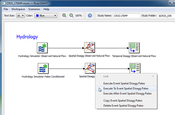 The hydrology-related events link to one another, but not to other types of events. Their purpose is to create traces of hydrology data that can be moved into RiverWare through a separately configured RiverWare DMI event. Generating hydrologies can be time-consuming, and once configured properly, these events are not typically rerun unless some input data has changed.