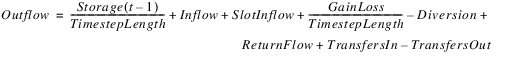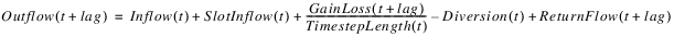 • Otherwise, GainLoss(t+lag) may be specified (by Input, Object-level Accounting Method, or Rules), or it defaults to zero. The Inflow, Slot Inflow (must be zero), and Diversion all occur before the lag; Gain Loss and Return flow occur after the lag (that is, on the lagged timestep). Outflow is calculated as follows: