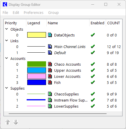 The Display Group Editor provides the ability to create groups of links, groups of objects, and if accounting is enabled, groups of supplies and groups of accounts. The display properties (including color, line width, shading, etc.) and the membership of a group can be changed by double-clicking that group. The membership of the groups need not be mutually exclusive. The groups are prioritized. For example, if two link groups contain the same link, the group highest in the list (lowest priority number) will be used to set the display properties of that link. Display groups can be enabled and disabled by selecting the check mark in the Enabled column.