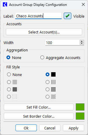 The membership of the group and the fill style, fill color, account width, account aggregation, and border color of the group members can be set with this window. The membership of Accounts within the group is controlled by selecting the Select Account(s) button. The selection uses the standard Object/Slot/Account/ selector window and wild cards and filters can be used to select the appropriate accounts. An account can also be added to an Account Display Group by right-clicking the account on the workspace, mousing over Add to Account Group, and selecting the desired Account Display Group. If the account is already a member of an Account Display Group, this option will be replaced with Account Group Membership. Mousing over this option will show the display group to which the account belongs.