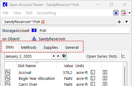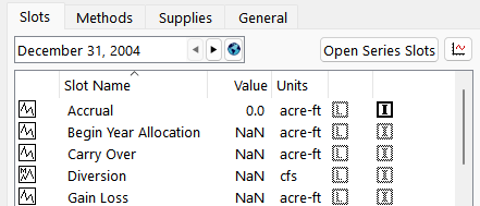 The Slots tab shows all of the slots on the account. Double-click on a slot to bring up a view of that slots data. If the slot is a multi-slot, both the total and the components will be shown. This is another location where accounting data can be entered or edited. In the Slots tab, there is also a date time spinner to scroll to a specific date and a plot button to plot the selected slot(s).