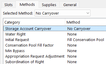 The Methods tab is used to select methods associated with a given account. For example, there are categories that have to deal with the calculation of Initial Request for water rights appropriation, Storage Account Carryover, and whether this account has a water right. Methods in the Storage Account Carryover category determine the storage carryover on the Begin Accrual Date.