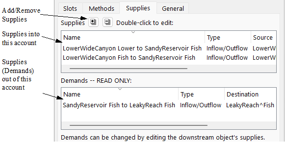 The demands area is used to view the supplies leaving the account. The demands are read-only; nothing can be changed. To edit a demand, the user must open the downstream object and edit the supplies entering the downstream object.