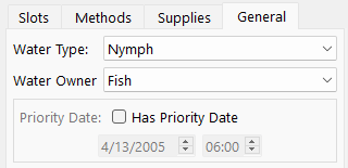 General tab is used to configure general properties of the account. The user can select the Water Type and Water Owner, although the types must already be defined in the Account System Configuration. The user can also specify a Priority Date for the account, where applicable. The