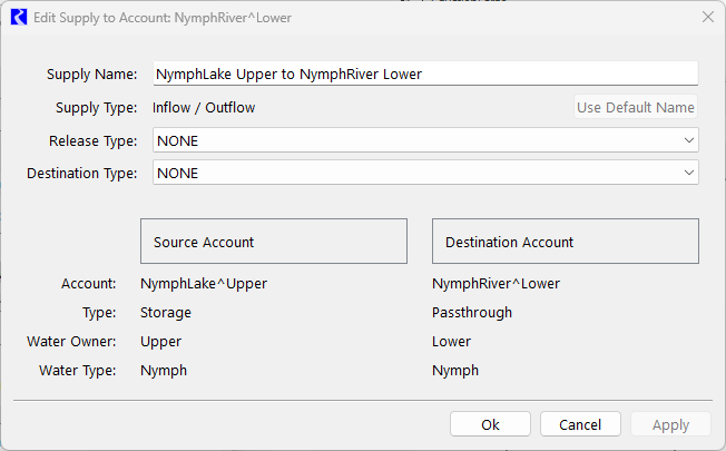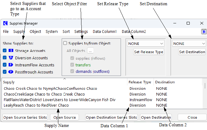 The Supplies Manager can show all the Supplies in a model or a filtered subset of Supplies. The user can filter supplies by the type of the destination account. This is done using the Show Supplies to toggle area and selecting one or more of the following types: Storage, passthrough, instream flow, and/or diversion accounts.