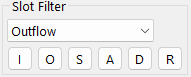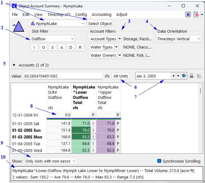 The slot entity (Outflow, Inflow, Storage, etc.) shown in the summary area is selected using the menu. The most common slot types can be quickly selected using buttons: I = Inflow, O = Outflow, S = Storage, A = Accrual, D = Diversion and R = Return Flow. Use the menu to select other slots on the accounts.