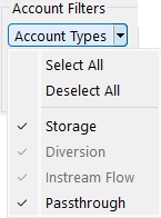 – Account Types: Accounts can be filtered by account type; that is, Storage, Diversion, Instream Flow or Passthrough, using the menu option. The options are enabled based on the types of accounts that reside on the object. Each of the filters is controlled by a menu button. Click the button to display a drop-down menu listing the options. Select or deselect the account attributes associated with the accounts as desired. The account filter menus include operations to select or deselect all the items with a single click.