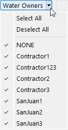 – Water Owners: Similarly, accounts can be filtered by the Water Owners defined in the model, including the default NONE water owner. Use the menu option to select or deselect the desired Water Owners.