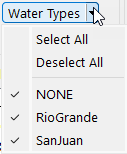 – Water Types: Similar to Account Types, accounts can be filtered by the Water Types defined in the model, including the default NONE water type. Use the menu option to select or deselect the desired Water Types.