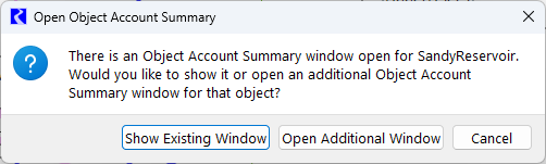 In all but the last case, if there is already an Object Account Summary open for the object, a confirmation is presented to either open the existing windows or open additional windows.