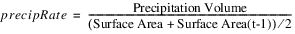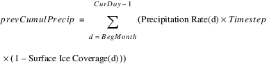 For a 1 Month timestep, this can be done based on the Precipitation Volume for the month, which was set in simulation. The Precipitation Volume calculation will already account for Ice Coverage if applicable. For a 1 Day timestep, Effective Precipitation must be calculated using the cumulative sum of Precipitation Rate from the beginning of the month to the current day, and Ice Coverage is included explicitly. At a 1 Month timestep the average surface area is used, whereas the current (end of timestep) surface area is used for a 1 Day timestep.