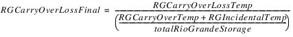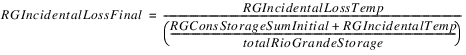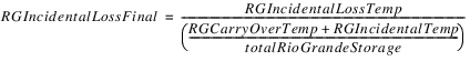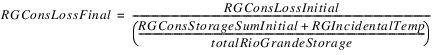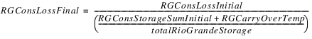 All other loss goes to the Rio Grande accounts. The temporary total Rio Grande loss is calculated as the difference between the Hypothetical Condition Loss and the Pre-Reservoir Condition Loss. If the reservoir has RioGrande “Conservation accounts,” that is any account of Water Type RioGrande that is not the “RioGrande” account, and the accounts have non-zero storage, then they are given a fraction of the loss equal to its percentage of total Rio Grande water in the reservoir. All remaining loss goes to the RioGrande account.