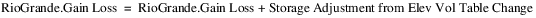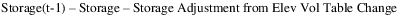 The Storage Adjustment from Elev Vol Table Change is applicable only if the Time Varying Elevation Volume method is selected for the Sediment category. It is removed at this point in the calculation because all loss from the Elevation-Volume change will be allocated later to the RioGrande account.