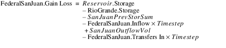 Note: The “Federal San Juan.Transfers In” component is used to represents a single transfer supply from the Rio Grande account to the Federal San Juan account. No other transfers In or Out from the Rio Grande or Federal San Juan accounts are supported. But, transfers from the Federal San Juan account to other San Juan water type accounts are allowed (their mass balance is accounted for in the SanJuanStorages term).