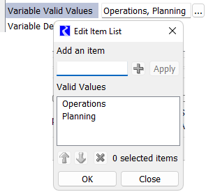 • Variable Valid Values - The valid or possible values the script variable can have. Specify the list of text items in an Edit Item List dialog that is opened by clicking the “...” button. A sample is shown in the screenshot. Two items have been added.