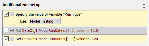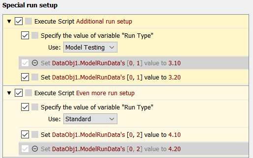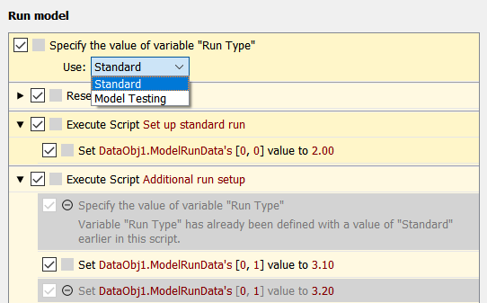 However, because the “Additional run setup” script is being executed as a subscript of the “Run model” script, only the variable definition in the “Run model” script takes effect. Furthermore, the first of the “Set DataObj1.ModelRunData” actions is enabled because it executes when “Run Type” has a value of “Standard” while the second is disabled because it executes when the variable has a value of “Model Testing”.
