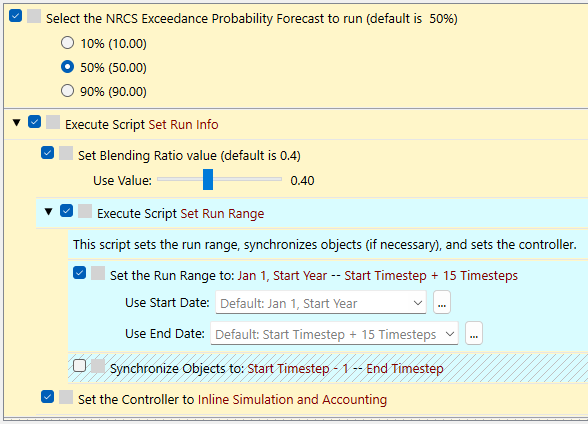 Figure 1.32 shows a script with two levels of sub-actions. Set Run Info calls Set Run Range (light blue background) Notice that all sub-actions are indented including the dividers and disabled status background. Use the override controls to modify the sub-actions as desired.
