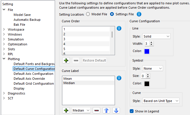 Also, an option was added to specify the default curve configuration based on the Curve Label. When used, any curve with a label that ends with the specified text will be given the specified configuration by default. For example, any slot name ending with “Mean” may be given the specified curve configuration when initially added to a plot.