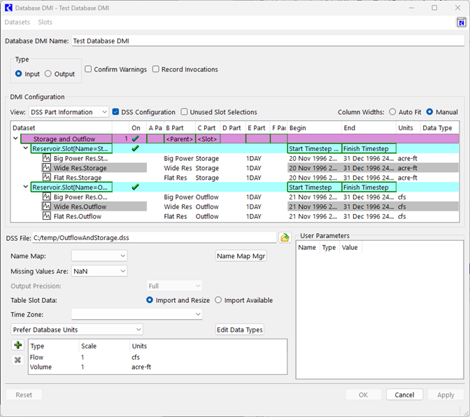 • Use the Database DMI Editor. The Database DMI Editor allows you to create a fully functional DSS Database DMI from a single dialog and provides access to other dialogs for Excel, HDB, and web service DMIs. It fully expands the slot selection to show the exact configuration that will be used. For example, it displays that BigReservoir.Inflow will be imported using BigRes Res-Inflow and displays the part information and units that will be used.