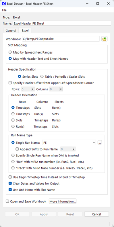 9. Specify the Header orientation and specify a sheet name, for example PE. In this sample, use the Timestep, Slots, Runs option.