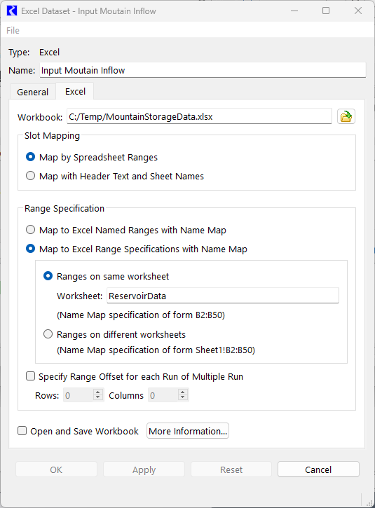 21. Select the Excel tab and type in or navigate to the worksheet where the data resides. In the sample, it is in C:/Temp/MountainStorageData.xls.