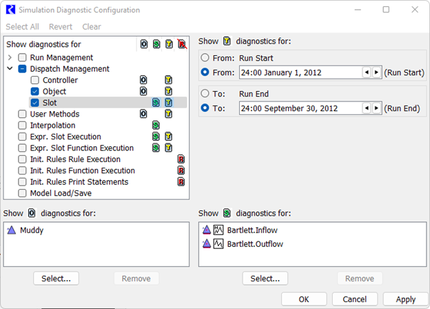 Object | Dispatch readiness for each object and time. Examples: • Slot (“Inflow”) added to known set. • Ready for dispatch method (“Solve given Inflow, No Routing”). • Slot (“Inflow”) is already in known set. • Re-dispatching using slot priorities. Priority 3R:Inflow Priority 7:Outflow Priority 7:Total Diversion Priority 7:Total Return Flow Priority 7:Total Local Inflow Conflicting slot values:(“Inflow” “Outflow” “Total Diversion” “Total Return Flow” “Total Local Inflow”). | |