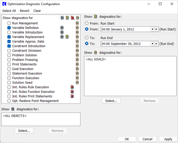 Init. Rules Print Statements | User defined messages for each initialization rule. For an Optimization run, there is no filtering based on rule name. When enabled, diagnostics are shown for all Initialization rules. Example: • Entering rule curve routine for January - July |
