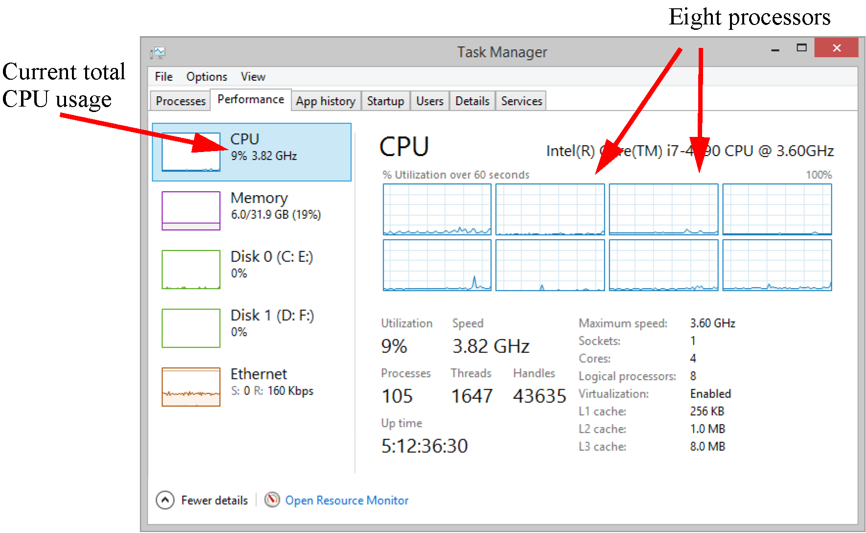 • Total physical memory (RAM) on the machine. In Figure 1.3, it is approximately 32 GB of RAM.
