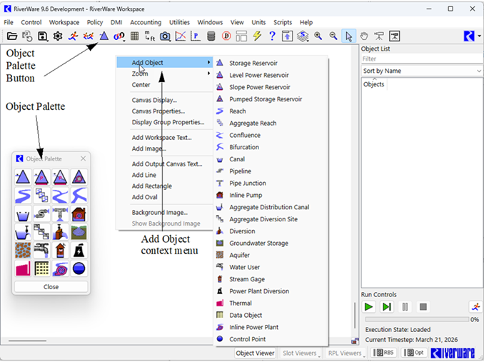 The Object Palette includes all available object types used to represent features of a river basin. To place objects on the workspace, drag them from the Object Palette to the desired location on the workspace.